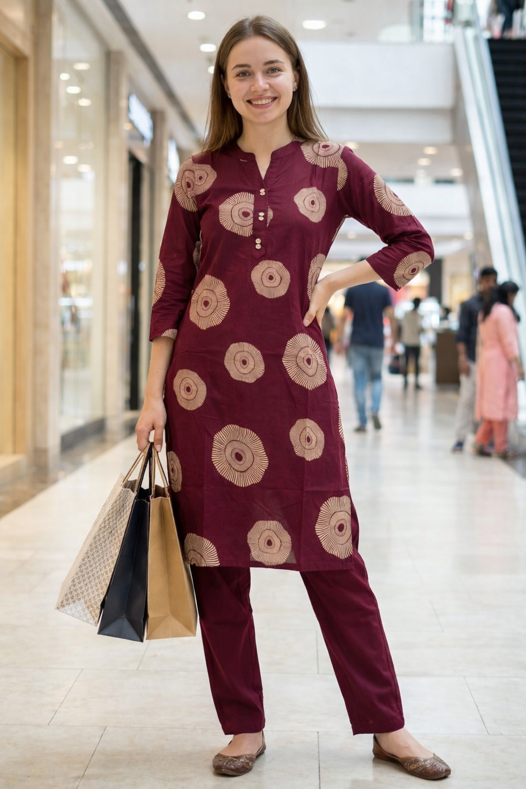 Crafted from soft and breathable Pure Mull Cotton, this outfit features elegant circular prints on a rich maroon base, giving it a modern ethnic charm. The lightweight fabric ensures all-day comfort, making it perfect for shopping days, office wear, casual outings, and daily elegance.
