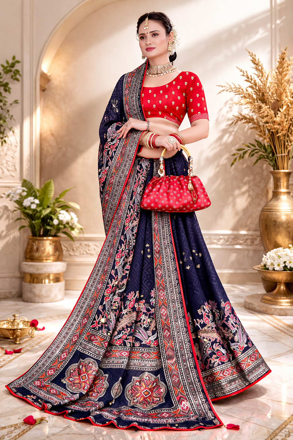 Drape yourself in this stunning navy-blue saree featuring intricate traditional motifs, paired with a vibrant red blouse for that perfect festive and wedding look. Designed for modern women who love classic charm with a touch of luxury.