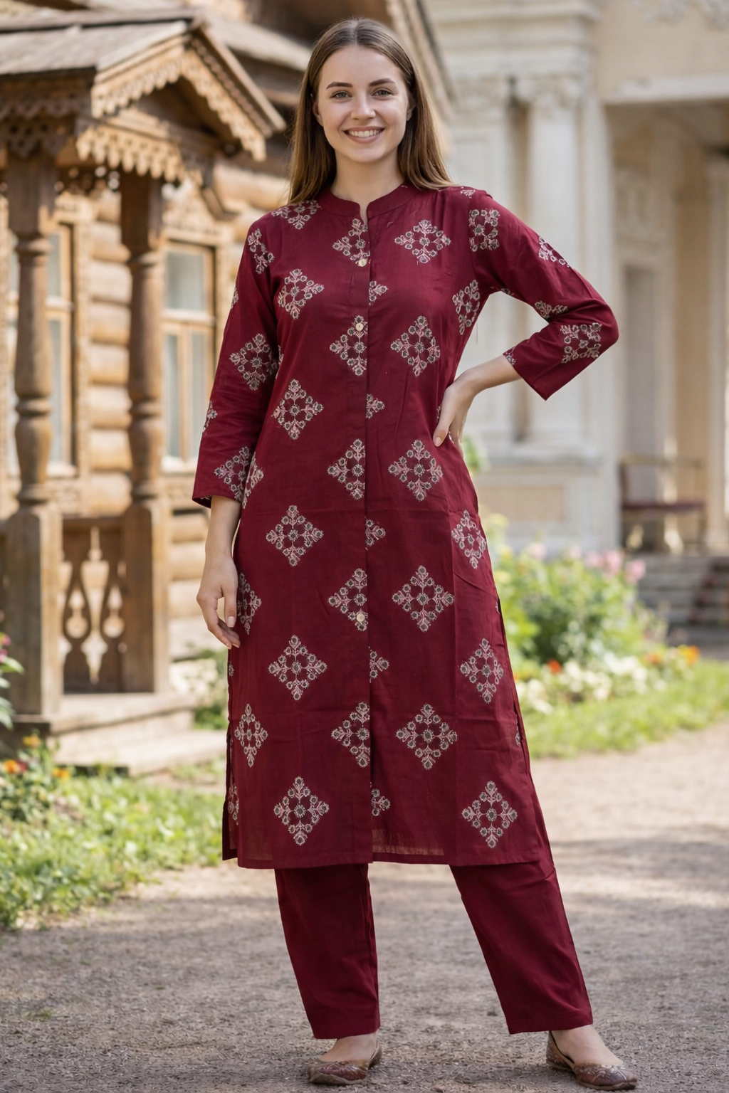 Crafted from soft and breathable Pure Mull Cotton, this set features elegant traditional motifs on a rich maroon base, giving it a classy ethnic appeal. The lightweight fabric ensures all-day comfort, making it perfect for daily wear, office, casual outings, and relaxed festive moments.