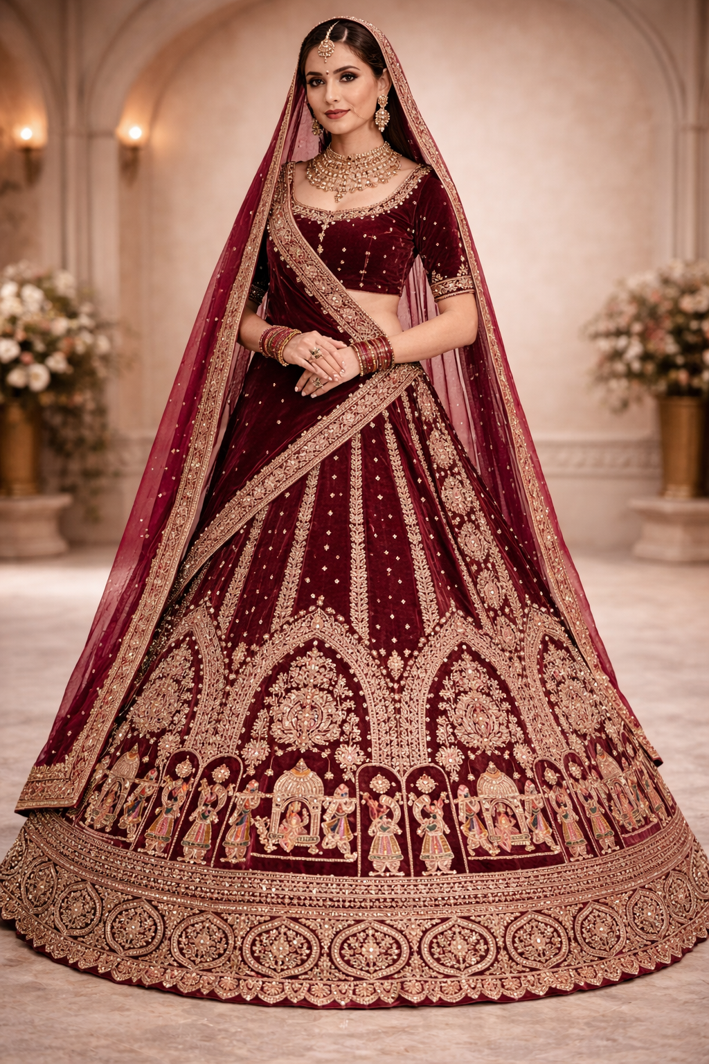 The luxurious velvet base, paired with a beautifully embellished dupatta and statement blouse, creates a regal silhouette perfect for weddings, receptions, and grand festive occasions. Every thread tells a story of elegance, making you the center of attention wherever you go.